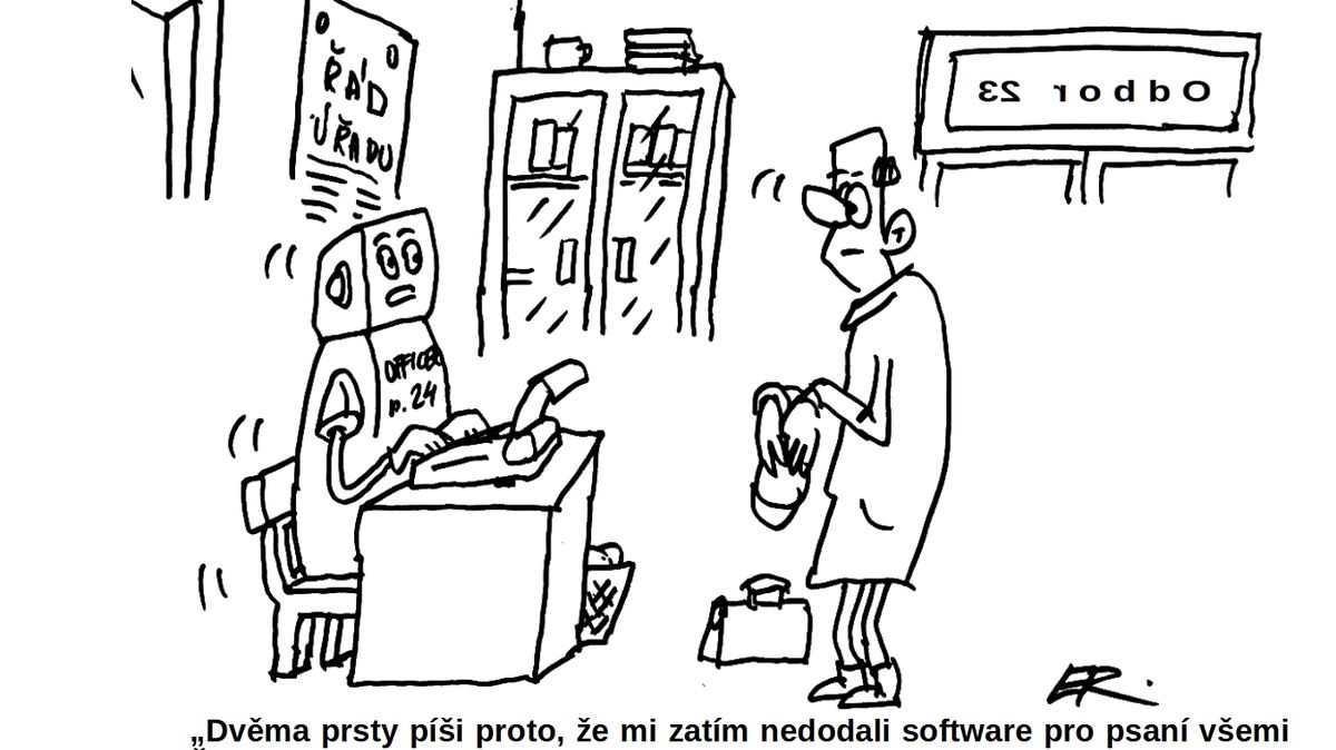 „Dvěma prsty píši proto, že mi zatím nedodali software pro psaní všemi deseti. - Že to ale dosti degraduje zatím dosažené výsledky elektronizace naší státní správy, je pouze váš názor, pane…!“
