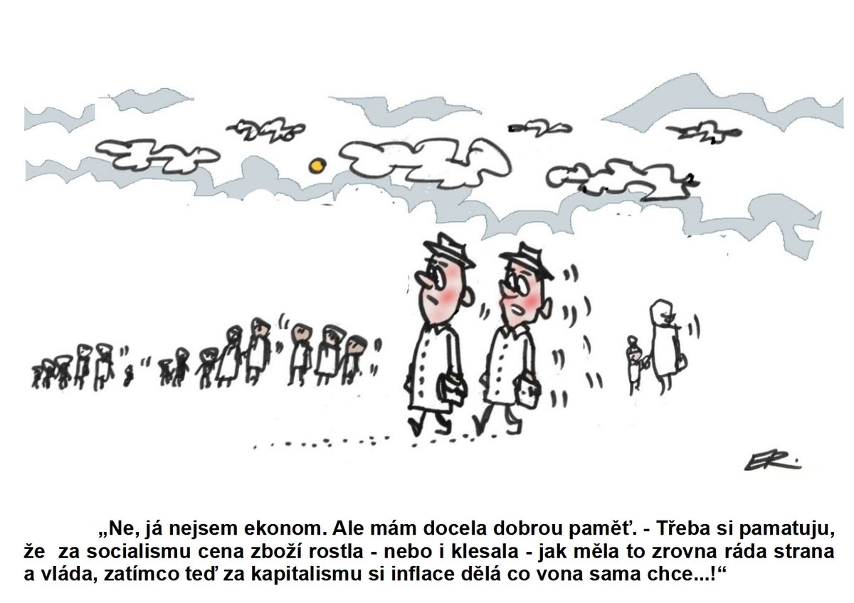 „Ne, já nejsem ekonom. Ale mám docela dobrou paměť. - Třeba si pamatuju, že za socialismu cena zboží rostla - nebo i klesala - jak měla to zrovna ráda strana a vláda, zatímco teď za kapitalismu si inflace dělá, co vona sama chce…!“