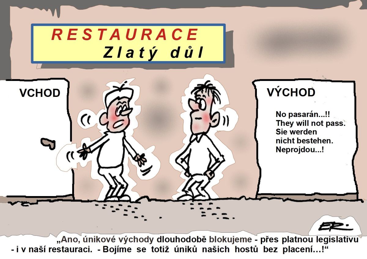 „Ano, únikové východy dlouhodobě blokujeme - přes platnou legislativu - i v naší restauraci. - Bojíme se totiž úniků našich hostů bez placení…!“