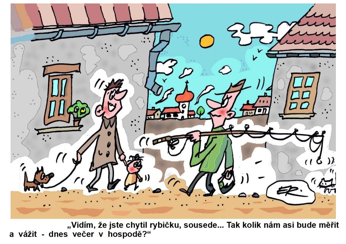 „Vidím, že jste chytil rybičku, sousede… Tak kolik nám asi bude měřit a vážit - dnes večer v hospodě?“