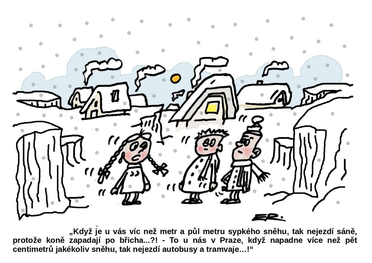 „Když je tady u vás víc než metr a půl metru sypkého sněhu, tak nejezdí sáně, protože koně zapadají po břicha…?! - To u nás v Praze, když napadne více než pět centimetrů jakéholiv sněhu, tak nejezdí autobusy a tramvaje…!“