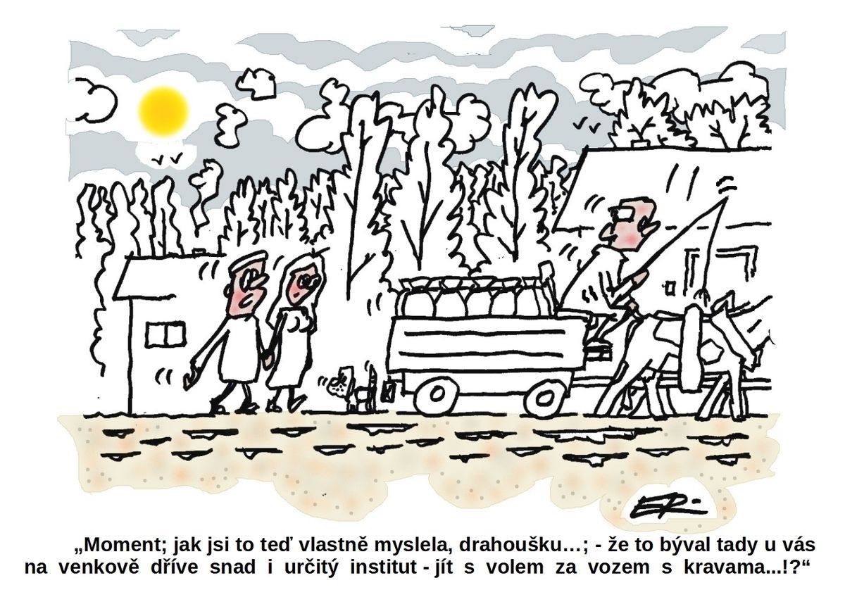 „Moment; jak jsi to teď vlastně myslela, drahoušku…; - že to býval dříve snad i určitý institut - jít s volem za vozem s kravama…!?“