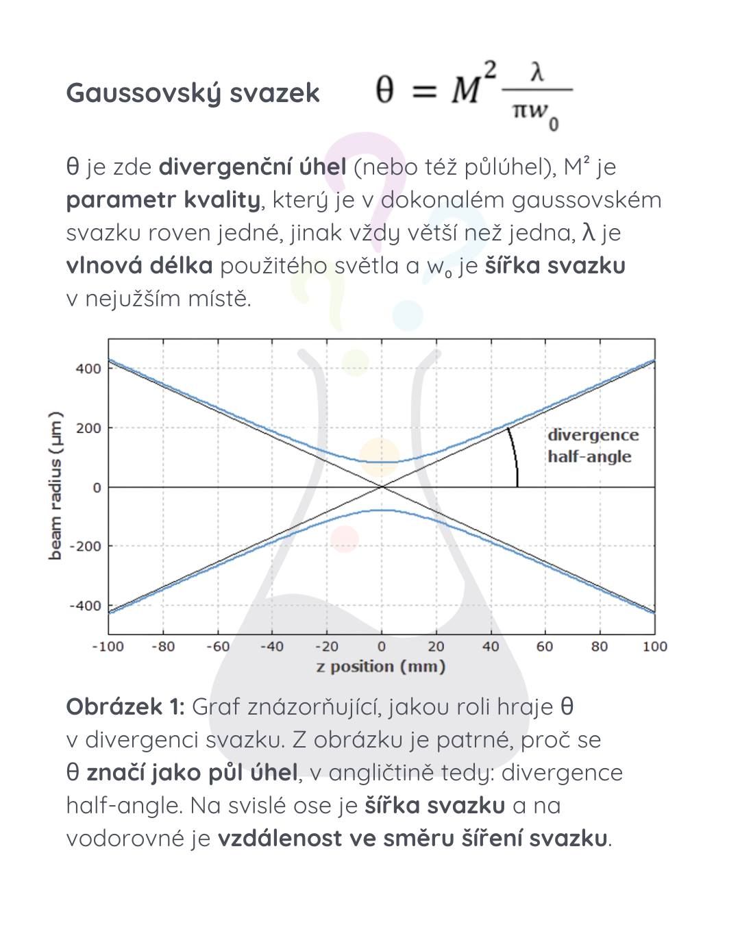Řešit tuto rovnici je poměrně složité, ale nebojte, v tomto textu se jí vyhneme. Z praxe totiž víme, že nejčastějším tvarem, nebo, chcete-li, nejčastějším řešením této rovnice je takzvaný gaussovský svazek [2]. Gaussovský svazek má tu výhodu, že kromě toho, že je to opravdu nejčastější typ laserového svazku, tak i má velmi jednoduchý vztah pro hodnotu divergence. Ten se dá nalézt třeba zde [3] a vypadá následovně (vzorec najdete na obrázku v komentáři).