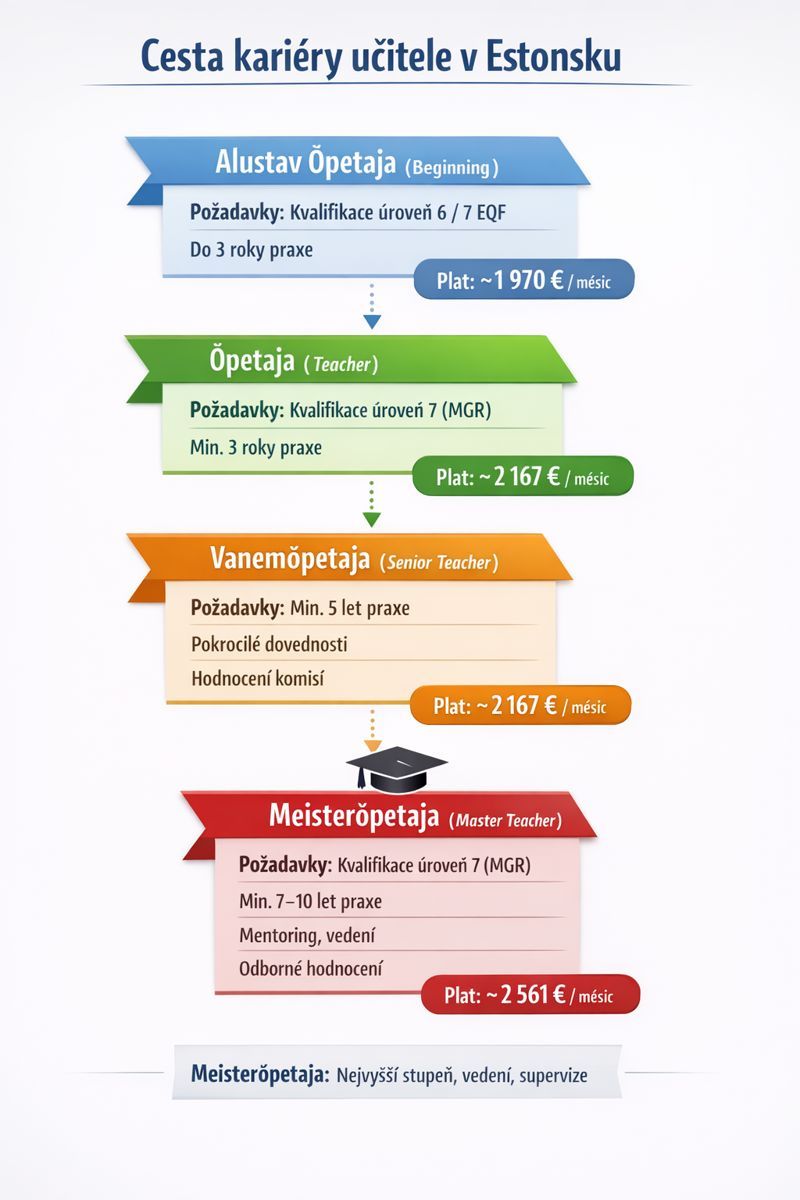 Pojďme tedy do Estonska a podívejme se, jak postup v kariéře učitele vymysleli tam. Tak předně kariérní řád učitelů v Estonsku má mít celkem 4 kariérní stupně: alustav õpetaja = začínající učitel, õpetaja = učitel, dále vanemõpetaja = vedoucí (starší) učitel a meisterõpetaja = mistr učitel. Za cíl si nový zákon (653 SE) klade rozvoj dovedností učitele, formování kariéry a s tím také úzce spojené odměňování.