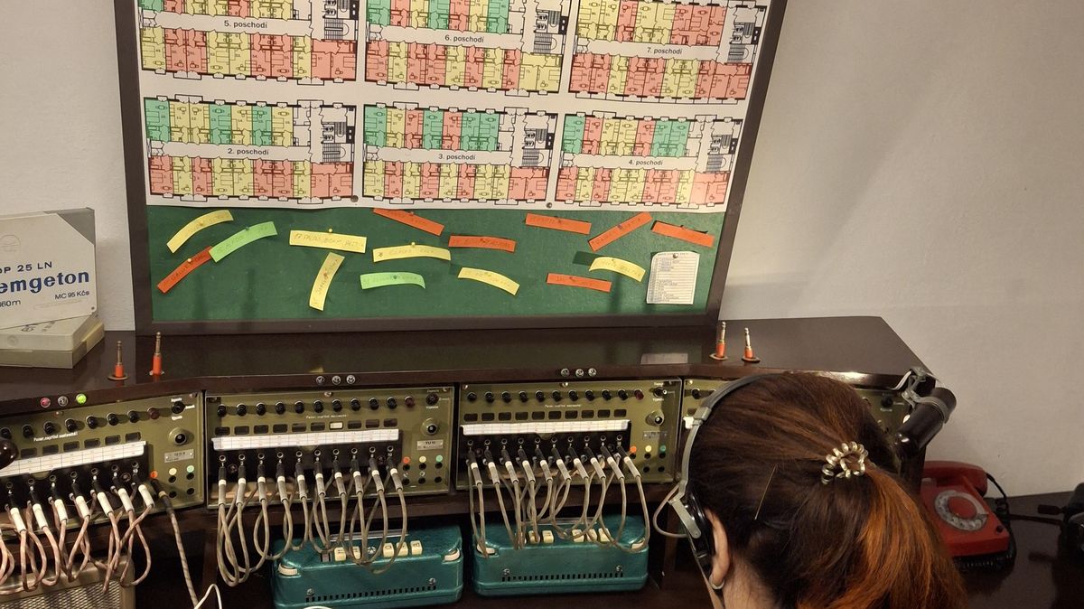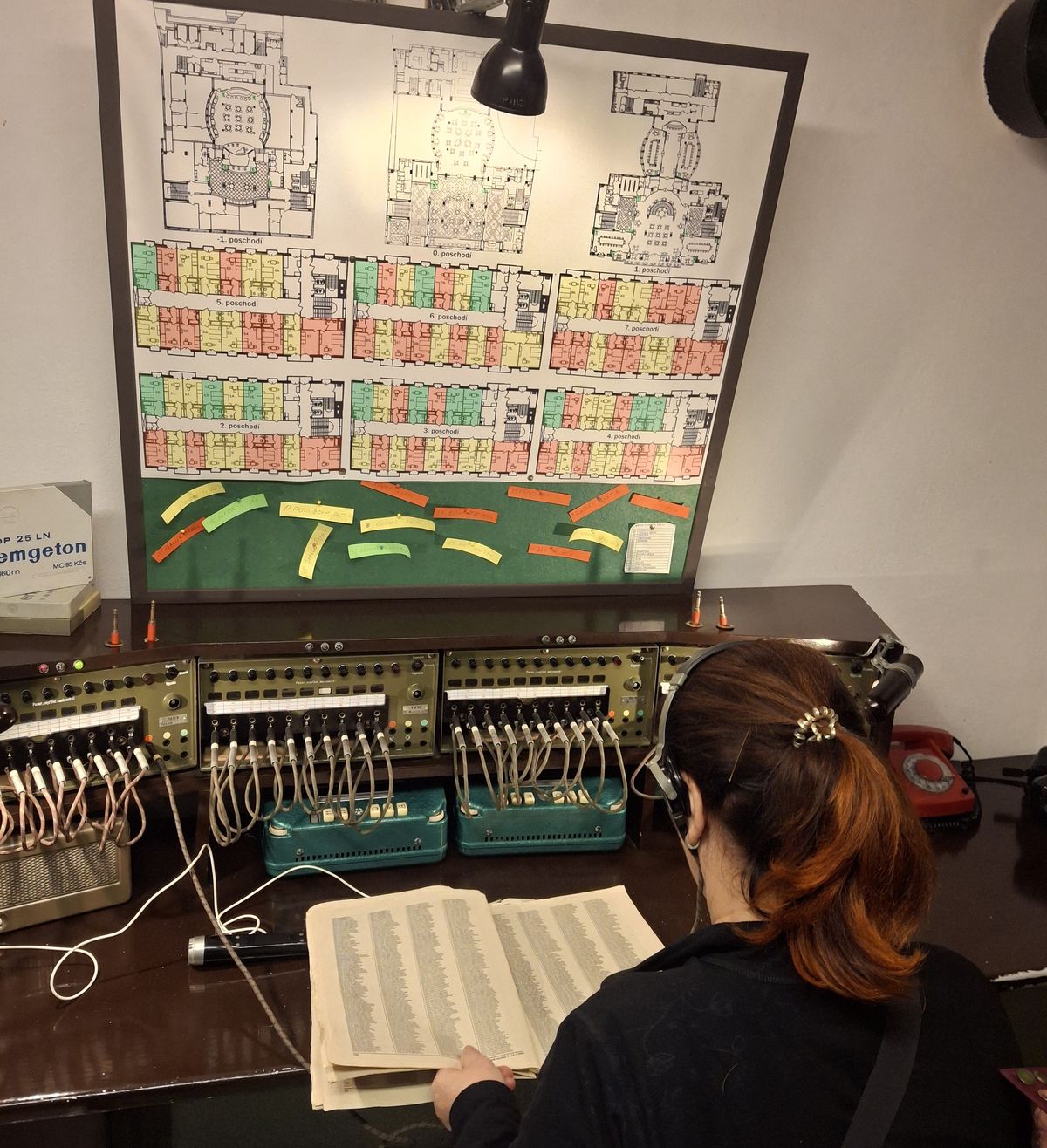 Přede mnou na zdi je plánek s pokoji hotelu Jalta a na stole vidíte odposlouchávací zařízení napojené na štěnice v pokojích. STB tady odposlouchávala hovory ubytovaných diplomatů a cizinců.