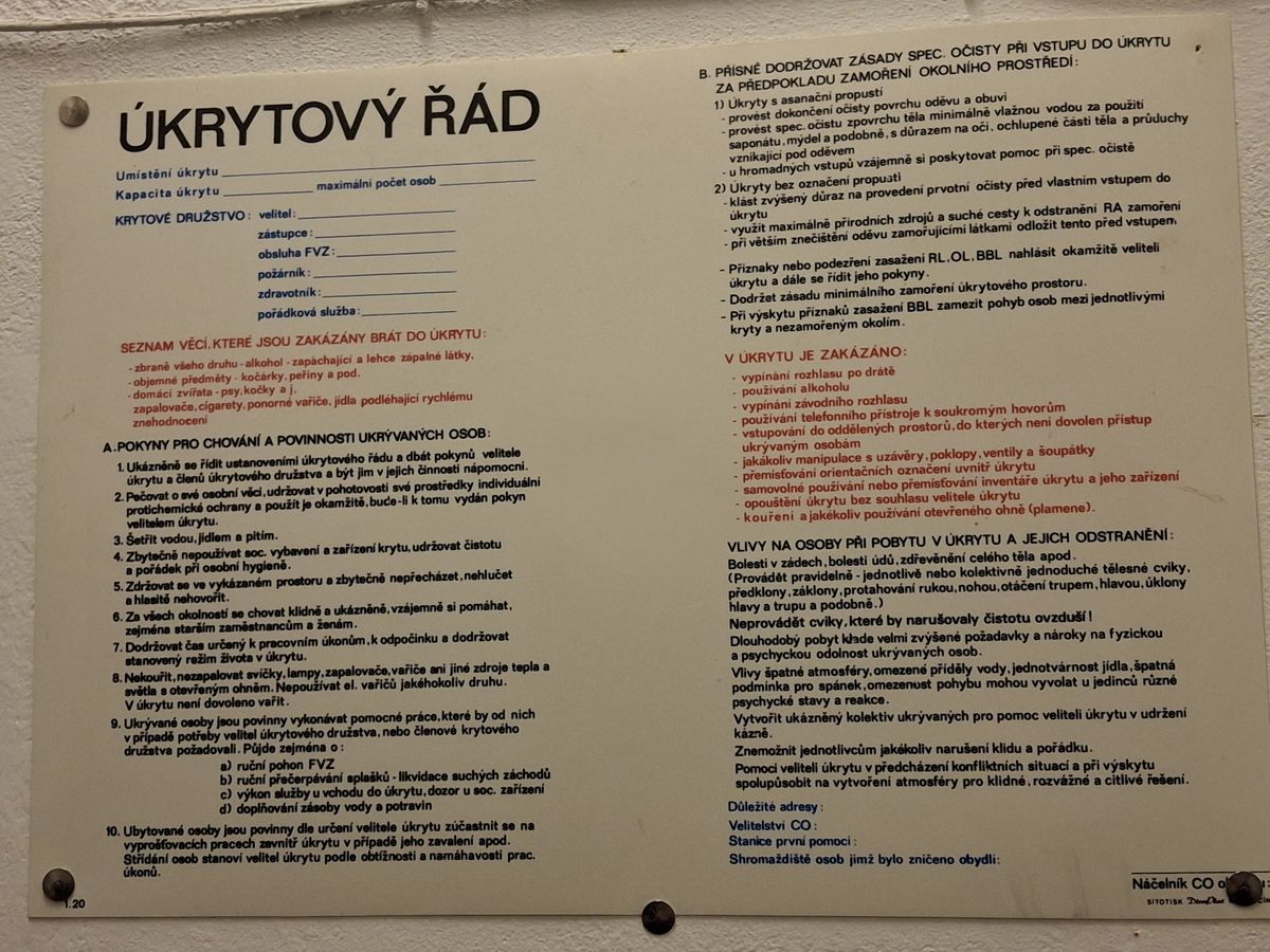 Na stěně ještě stále visí řád úkrytu, který předepisuje, jak se mají lidé v protiatomovém krytu chovat.