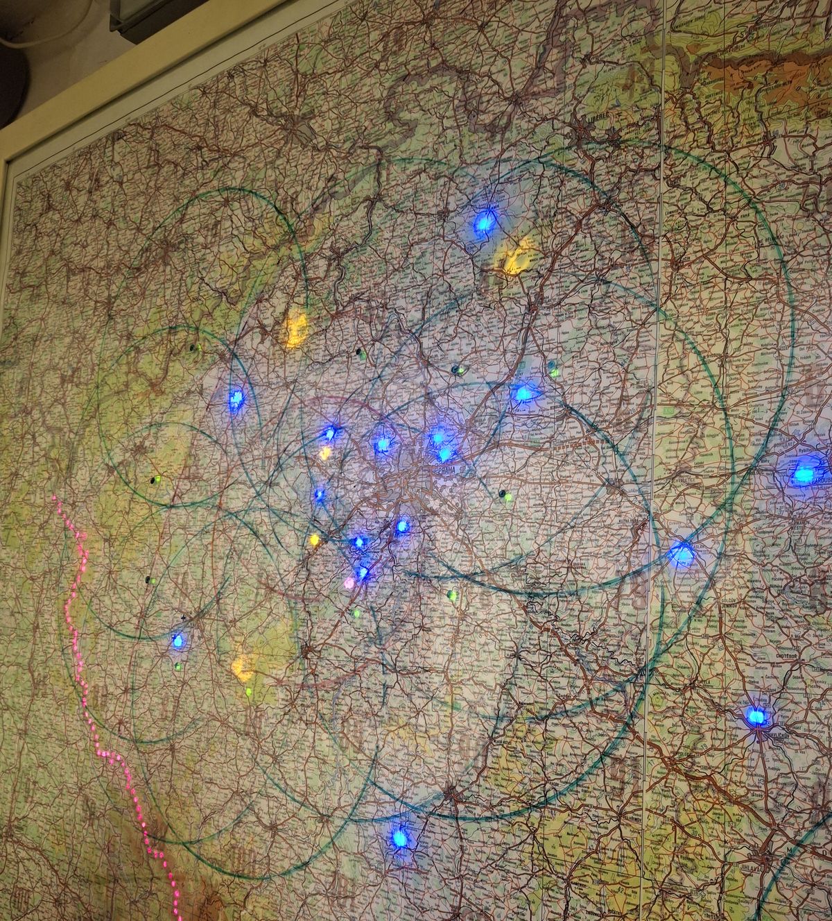 Mapa s rozmístěním sovětských střel na našem území a skladů jaderných hlavic. Pod různě barevnými světýlky lze vidět různé druhy střel.