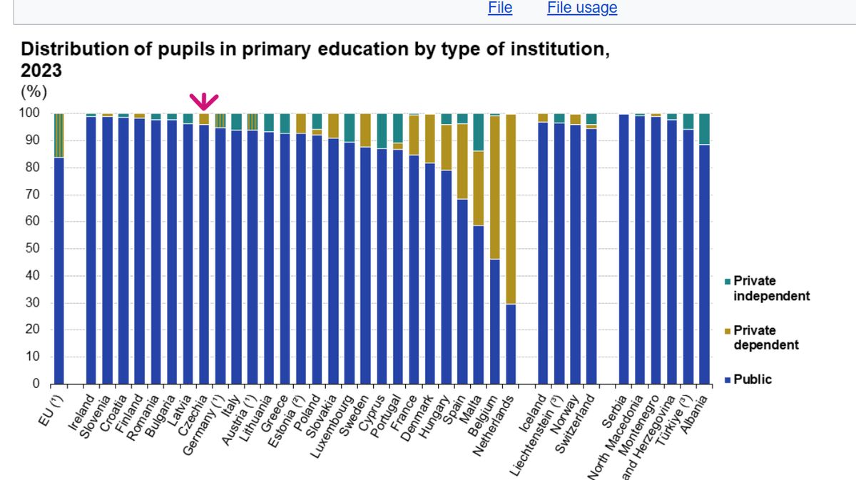 Trochu tady ale autory podezírám, že sdělením na konci filmu, že každý rok do soukromých škol nebo do domácího vzdělávání odchází čím dál více dětí, chtějí veřejnosti naznačit, že se tu koná jakási velká migrace směrem od veřejných škol do jiného typu vzdělávání. Jak už jsem ale psala, domškoláků máme jen 0,67 % a v soukromém základním školství je tu jen kolem 2 % dětí, zatímco průměr EU je kolem 17 %. Poslední data Eurostatu k tomuto tématu jsem objevila z roku 2023 a sami se můžete podívat, jak malý podíl dětí se u nás učí v soukromých základních školách. A k tomu ještě přidám svůj názor, že paleta různých typů škol se mi naopak moc líbí, a že bychom jich tu mohli mít ještě daleko více.